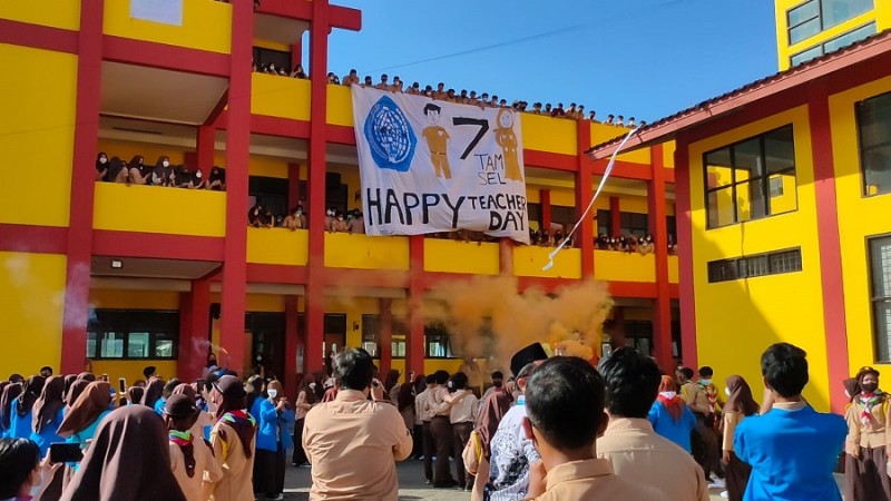 Bekasi, sman7tamsel.sch.id - Kamis, 25 November 2021 seluruh warga SMA Negeri 7 Tambun Selatan merayakan Hari Guru Nasional 2021 yang dilaksanakan di halaman sekolah yang serta dihadiri oleh sebagian siswa, para guru dan staff yang ikut memeriahkan acara hari ini. Diadakannya acara ini bermaksud untuk menciptakannya rasa menghormati, menghargai, serta mencintai para guru yang sudah berbaik hati memberikan ilmu yang bermanfaat untuk masa depan peserta didik.